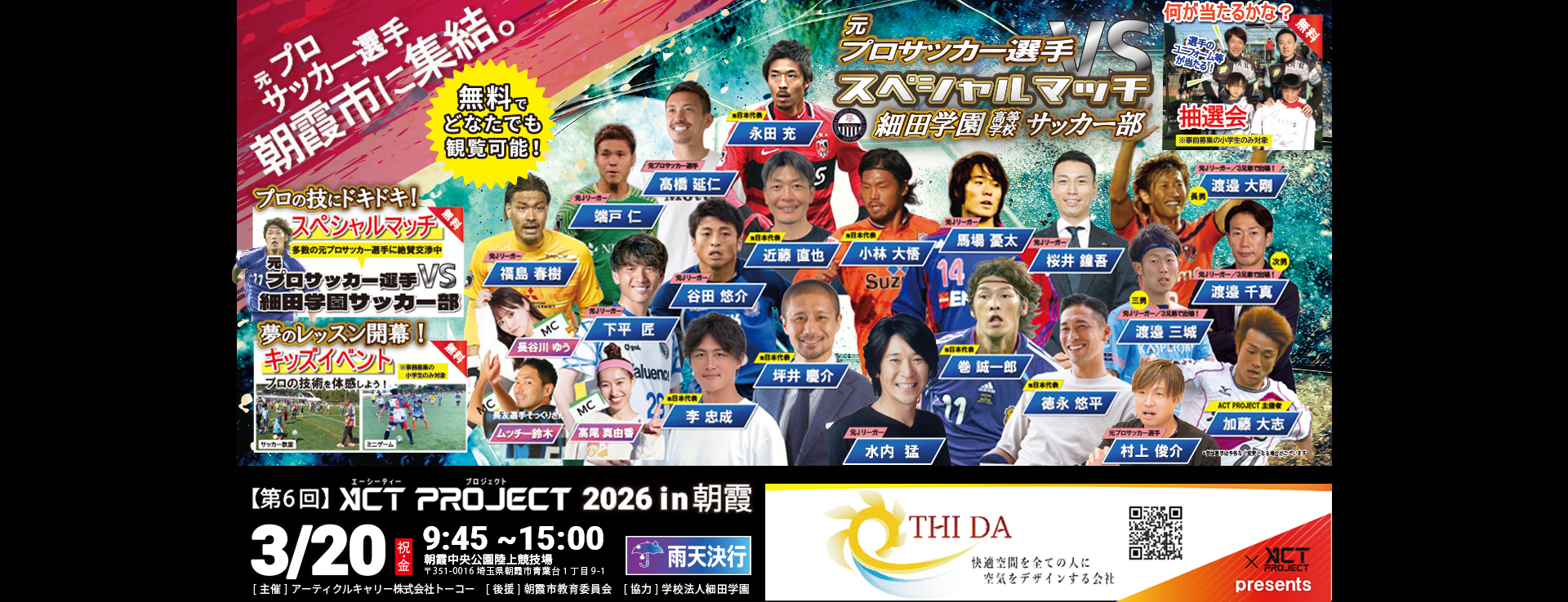 - 2026年3月開催(朝霞中央公園陸上競技場) イベント情報FW/加藤 大志 (ACTPROJECT主催者) 桐光学園高校から湘南ベルマーレ、京都サンガFCにて活躍。通算… 続きを読む: 2026年3月開催(朝霞中央公園陸上競技場) イベント情報