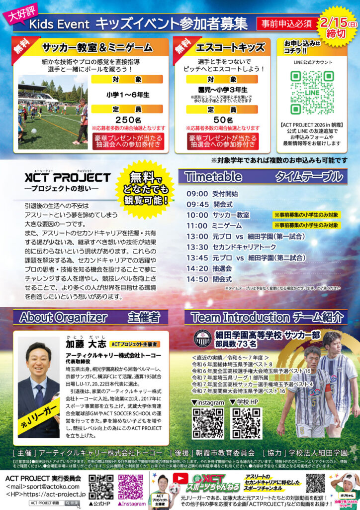 ACT PROJECT 2026 in 朝霞 サッカー教室&ミニゲーム/エスコートキッズ 募集開始!!